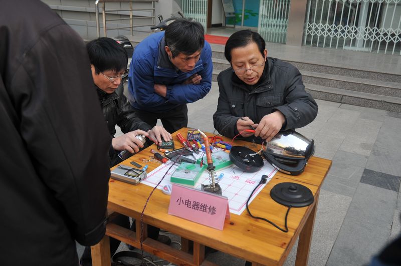 3月5日上午,雨花台中学民主促进会支部会员朱永康、张安忠和史成宝老师又相约来到雨花街道丁墙社区,为社区市民义务提供小家电修理、英语学习和摄影技巧指导等服务,共修理了收音机、播放器、空调遥控器、电水壶、豆浆机等电器近二十台,受到市民们的一致好评。