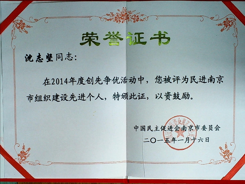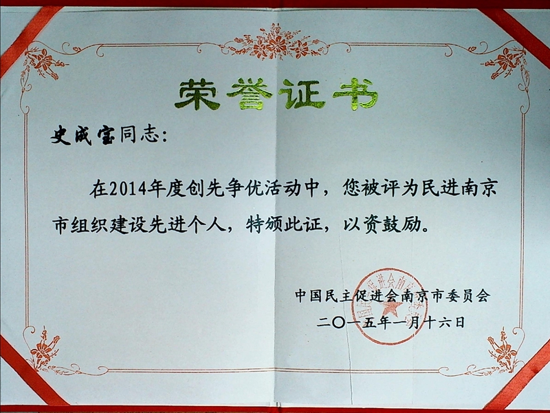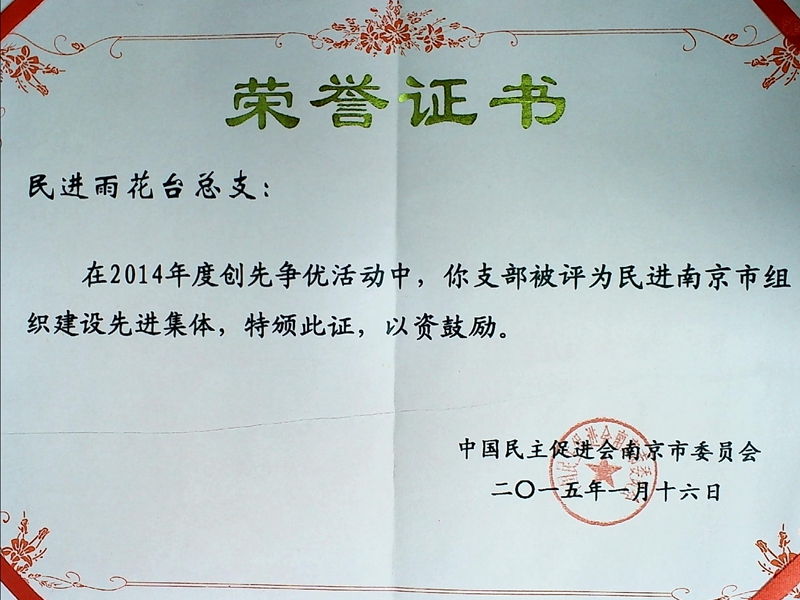 在3月17日下午召开的2015年南京民进基层干部大会上,我区会员黄超、沈志坚、张安忠、史成宝老师分别获得省、市先进个人表彰,民进雨花总支、综合支部获得市先进基层称号。