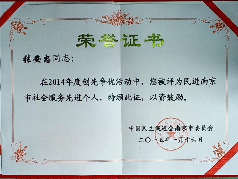 雨花张安忠、史成宝等会员获得民进市委会表彰