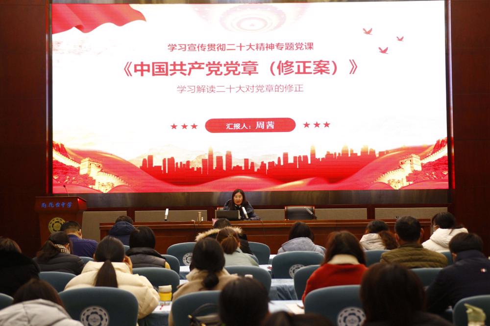 随后,雨花台中学党委书记周茜为全体党员教师带来学习宣传贯彻二十大精神专题党课:《中国共产党党章(修正案)》——学习解读二十大对党章的修正。周书记介绍了党章修改的基本考虑,并逐字逐句的带领大家从总纲与条文中对比学习新增内容。专题党课的最后,周书记号召党员同志要坚持学习、主动学习、深入学习,并结合自身教师岗位的特点,积极发挥党员的先锋模范作用,做课堂教学的示范者。
