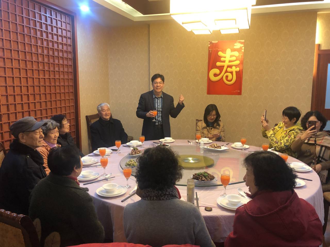 11月27日中午,雨花台中学茶餐厅内暖意融融,墙上张贴的金彩祥云寿字图更增添了喜庆气氛。20多位退休教师欢聚于此,参加2019年雨花台中学退休教师整生日祝寿和金婚庆典活动。