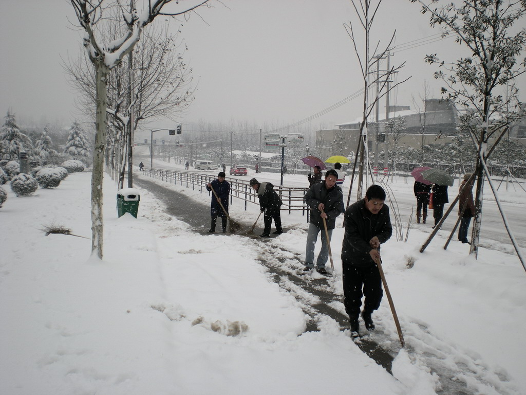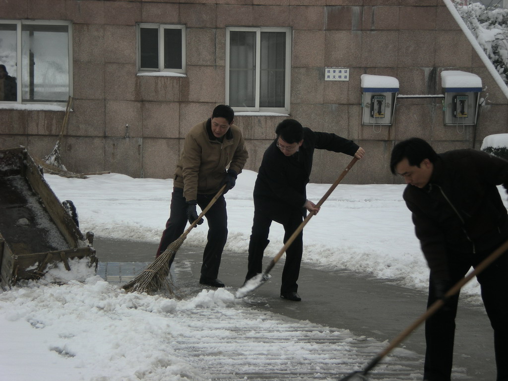1月27日早晨,暴雪再次覆盖学校。虽然是星期天,扫雪突击队员牢记着“雪情就是命令”,早晨7点钟,突击队员就陆续到达学校,在穆耕森校长的带领下,及时出击,将校园内外开辟出一条条绿色安全通道,确保了自行车道、人行过街斑马线、校园内主要通道的安全通行,扫雪过程中,天空再次飘起了鹅毛大雪,大家顶着雪花,全面完成了本次扫雪突击工作。我校及时清扫积雪的工作得到了路人和驾驶员们的一致称赞。