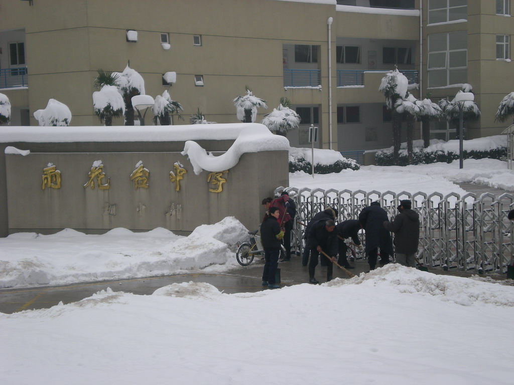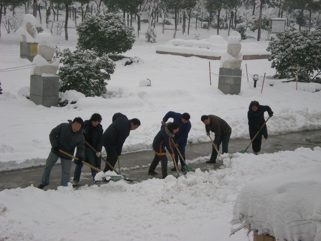 1月29日晨,地面结了薄冰,雨中扫雪突击队清理了已开辟道路的薄冰,确保行人通行安全。考虑到厚厚的积雪一旦结冰会保持很久,季正副校长率领总务处全体员工,开始对校园内积雪进行全面的清扫,力争将广场、路面的积雪全部扫清。