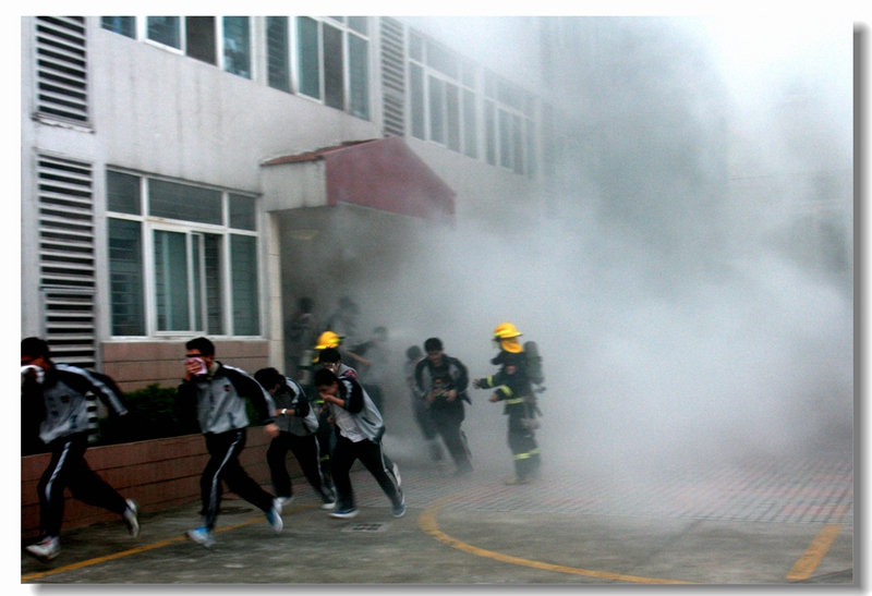 全体住宿生在宿管老师的指挥和消防官兵的引导下