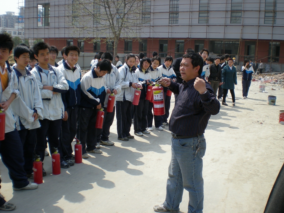 2008年3月27日,学校总务处后勤人员,在学校运动场工地进行了一次消防技能培训和消防演习.本次演习使用的100余支灭火器全部是即将回厂检修和换粉的灭火器.本次活动,部分教师及每个班级选派了部分学生到场进行了观摩和学习.