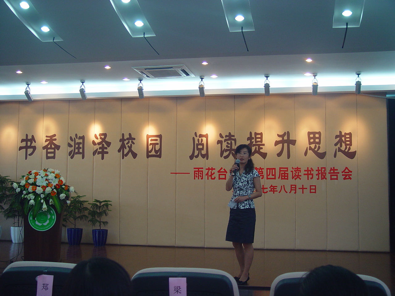 “书香润泽校园,阅读提升思想”,8月10日上午,雨花台中学举办了第四届教师读书报告会。盛云生副校长与梅岚、王磊、乜静、范星星、戴国庆等六位教师与全校教师分享了读书体会。报告会上有经久不衰的教育经典,也有自然朴素的教育随笔;有与“大家”的对话,也有与“小人物”的碰撞;有来自实践的教育智慧,也有对职业价值的追问;有浪漫的情怀,理想的追求,也有现实的困惑与迷茫……现场教师深受启发,陈金秀、茆国芳、肖长苏、韦伟、杭秉全、夏秋慧、周勇、李成香等教师做了即兴发言,整个会场洋溢着自由民主和谐的读书氛围。“读书增长知识,读书丰富情感,读书提升思想”,读书已逐渐成为雨中教师的职业习惯、生活方式。