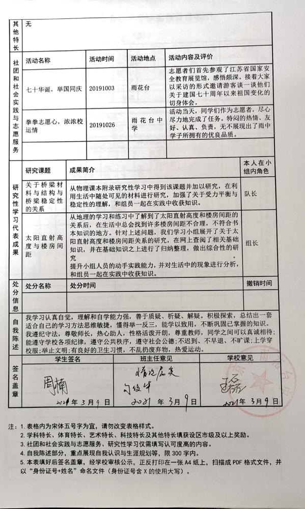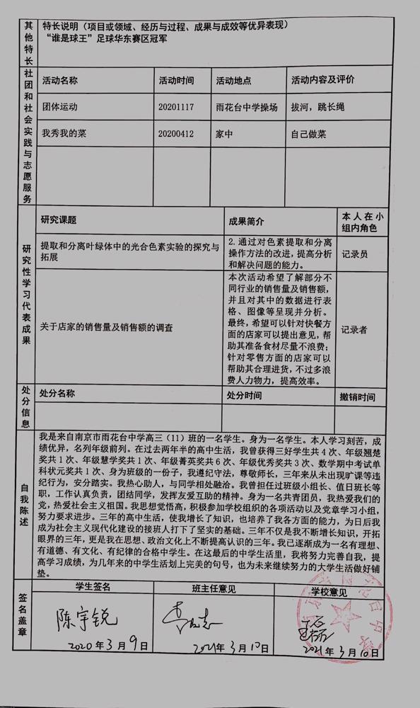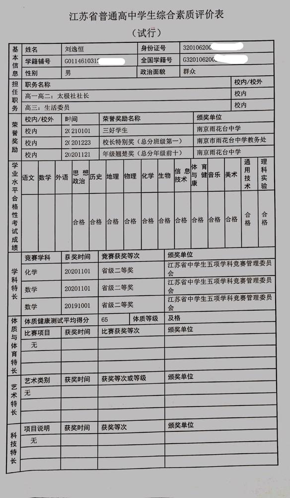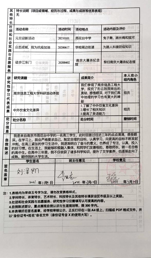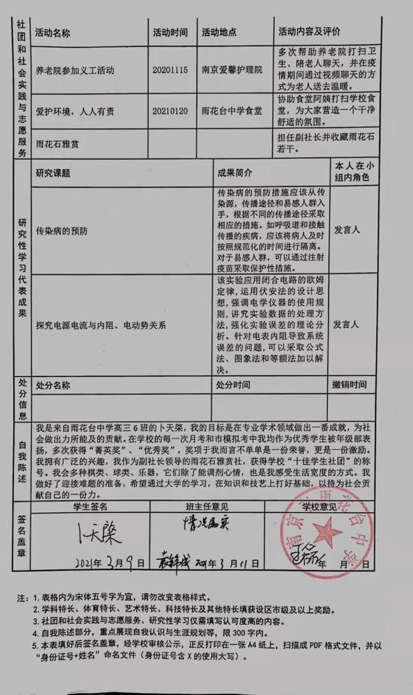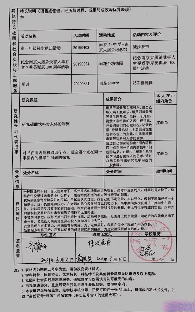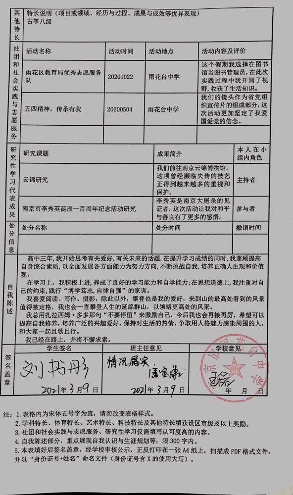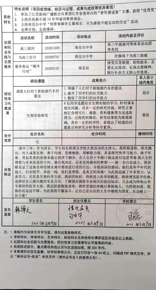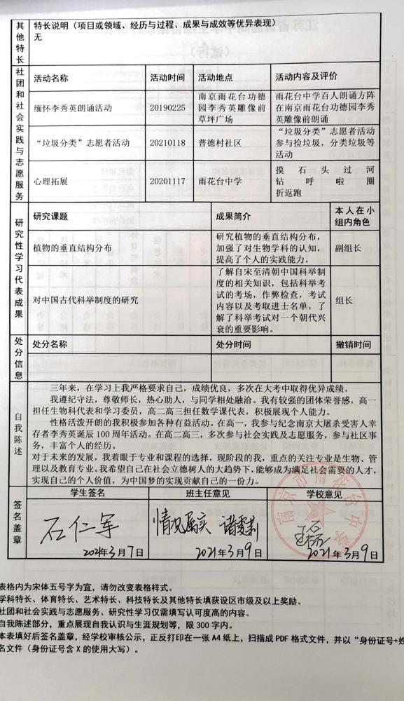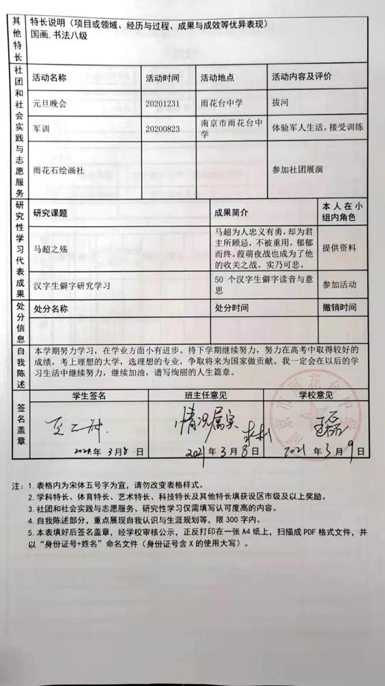2021年雨花台中学拟报考高校“强基计划”的“综合素质评价”内容已经经过审核,现公示如下。公示时间2021年5月19日-25日,如有异议,请向课程教学处张公法主任反映。具体考生名单及“综合素质评价表”公示如下: