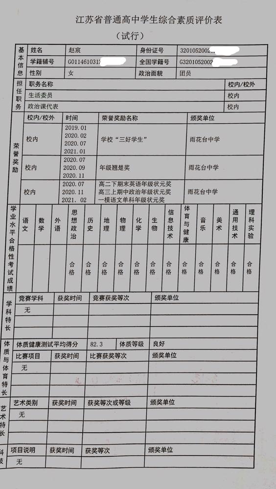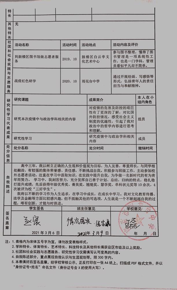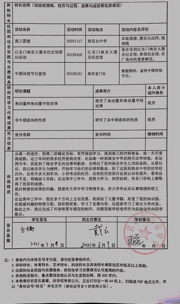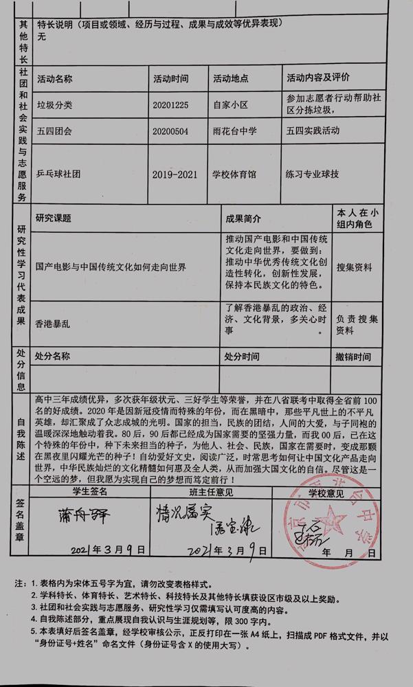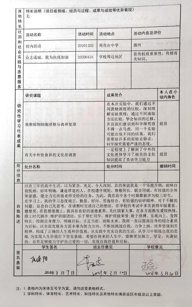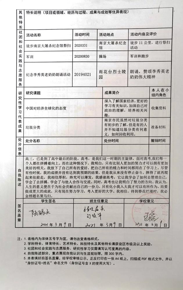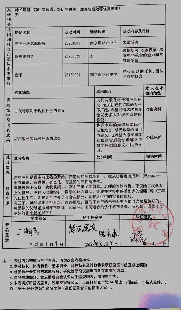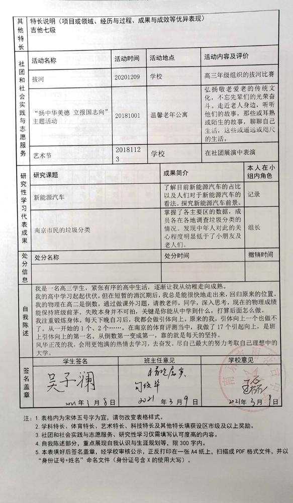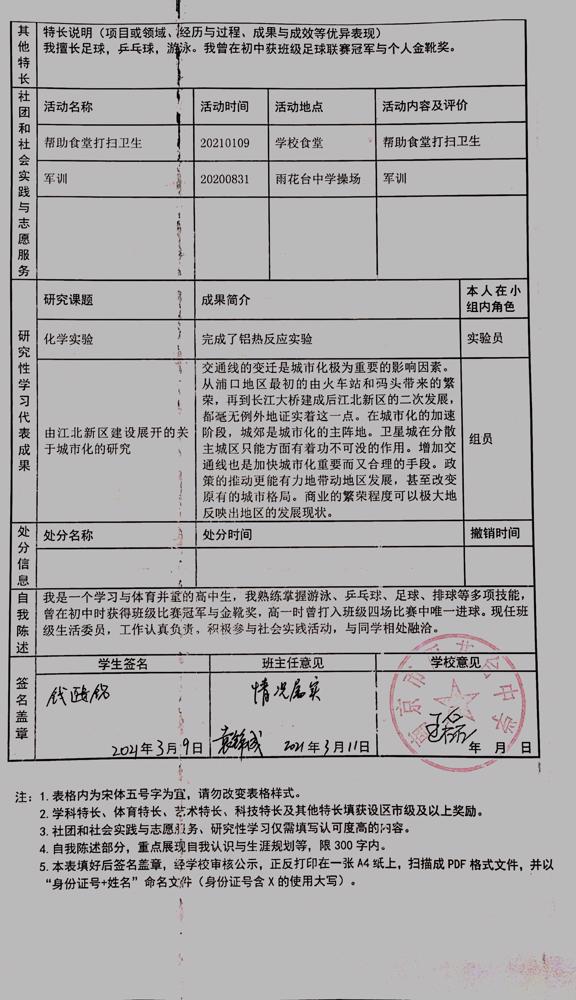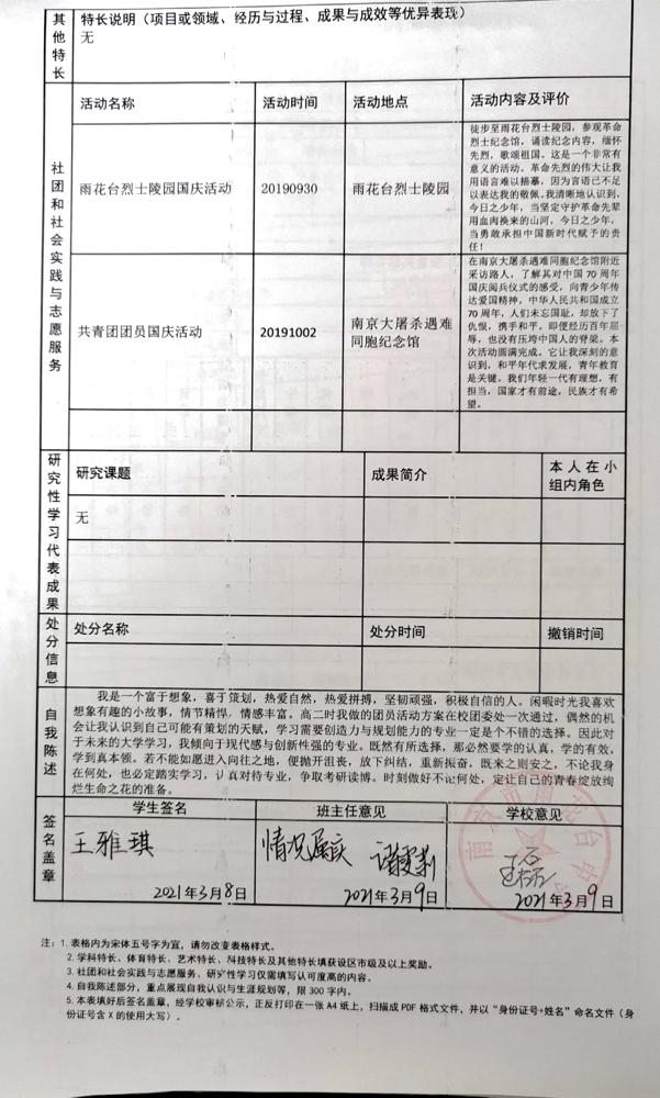 2021年雨花台中学拟报考高校“强基计划”的“综合素质评价”内容已经经过审核,现公示如下。公示时间2021年5月19日-25日,如有异议,请向课程教学处张公法主任反映。具体考生名单及“综合素质评价表”公示如下: