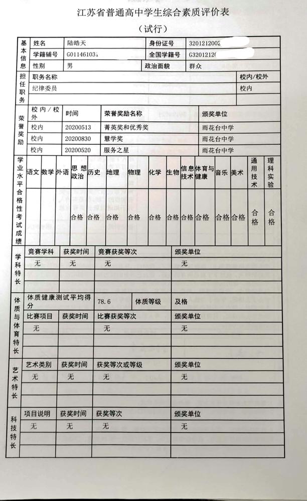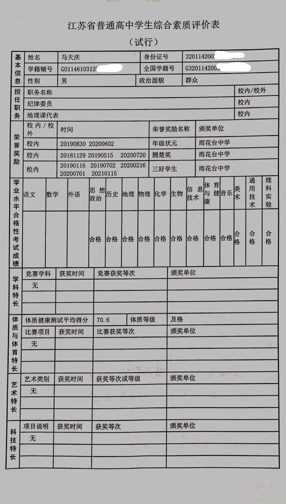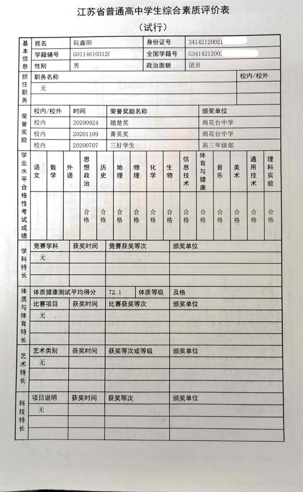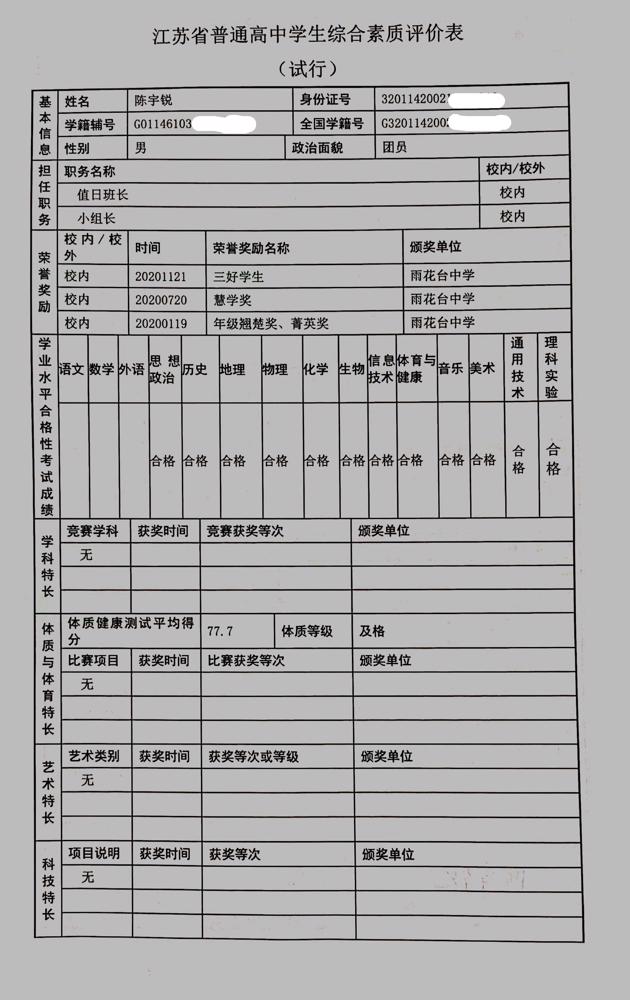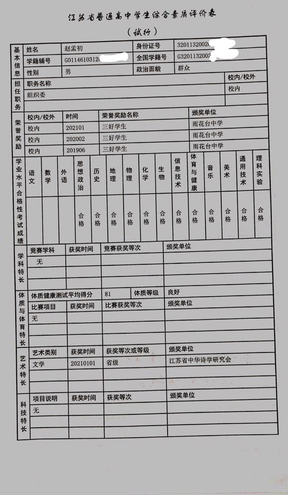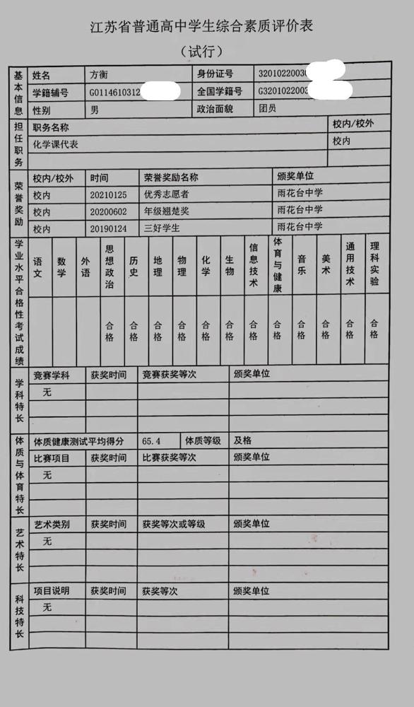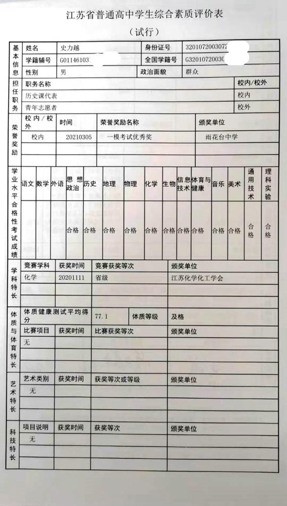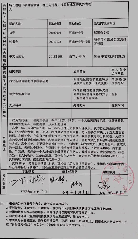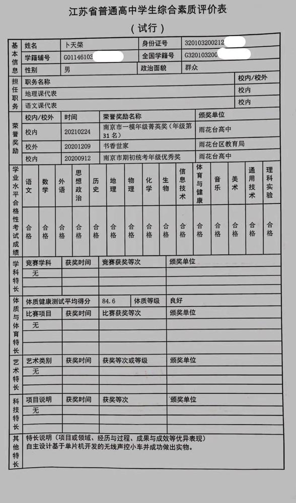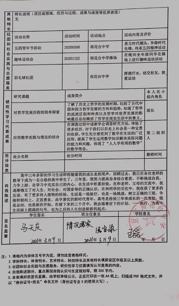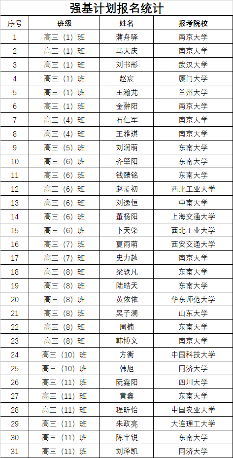 2021年雨花台中学拟报考高校“强基计划”的“综合素质评价”内容已经经过审核,现公示如下。公示时间2021年5月19日-25日,如有异议,请向课程教学处张公法主任反映。具体考生名单及“综合素质评价表”公示如下: