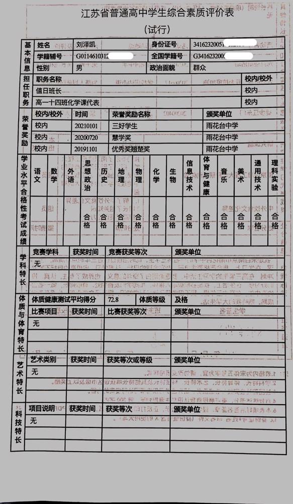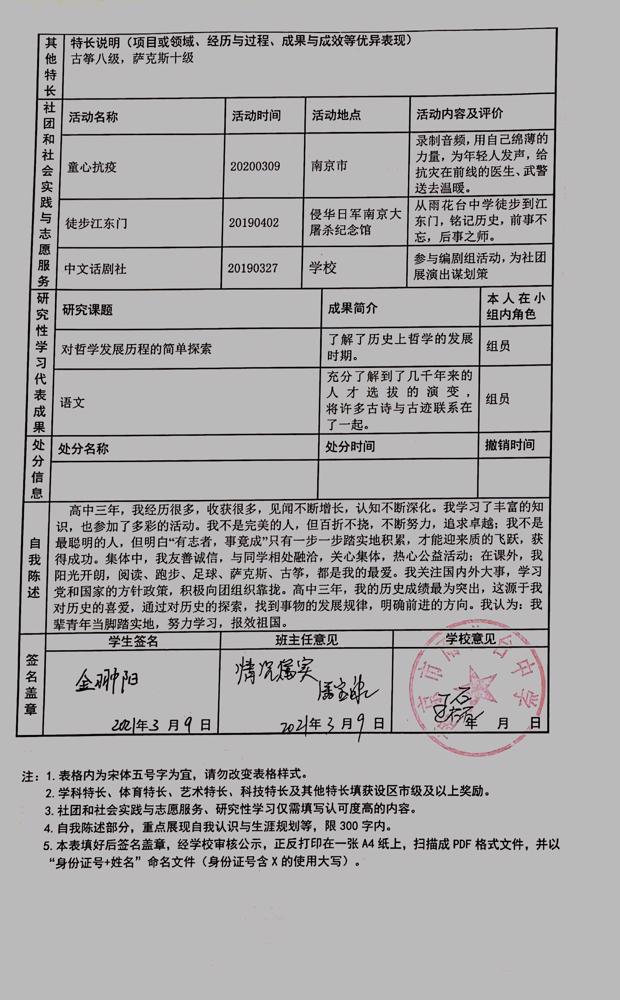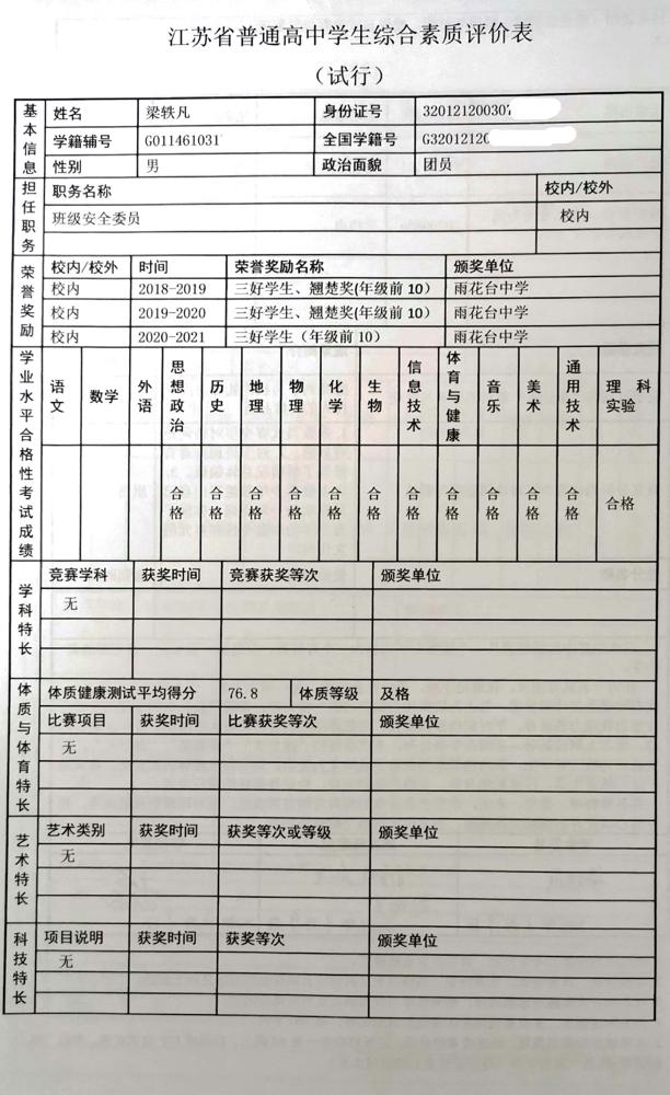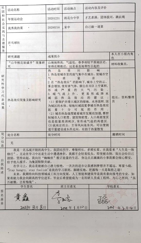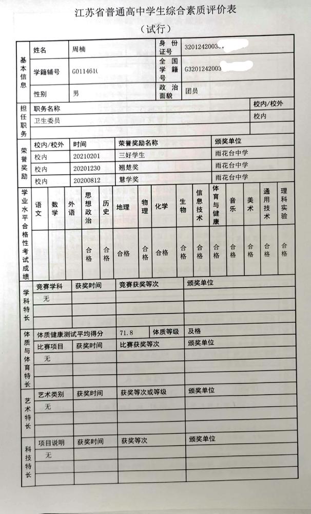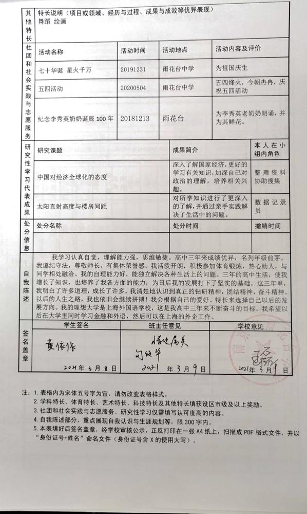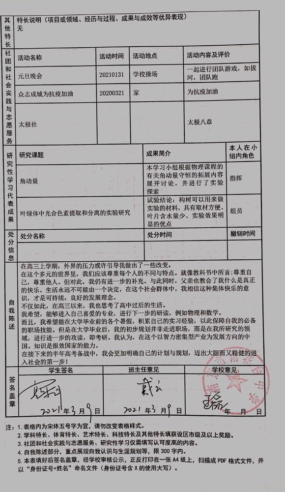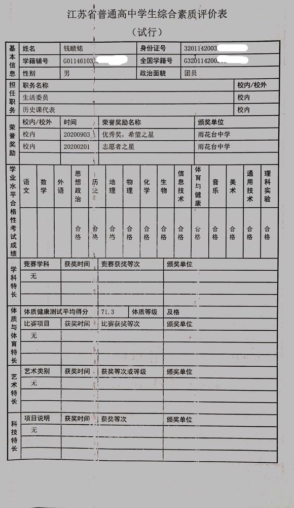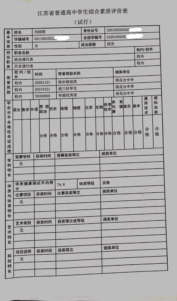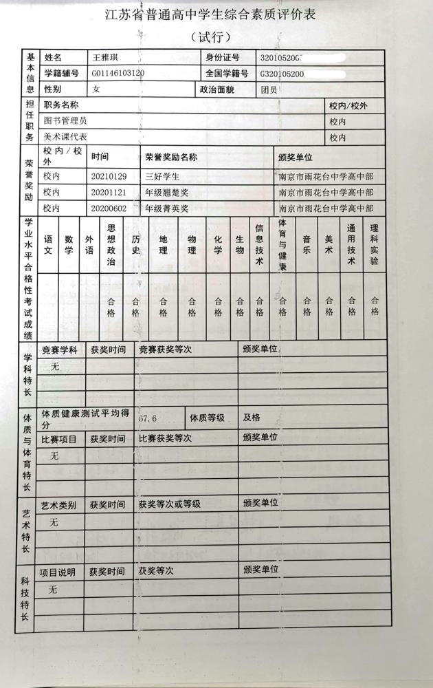 2021年雨花台中学拟报考高校“强基计划”的“综合素质评价”内容已经经过审核,现公示如下。公示时间2021年5月19日-25日,如有异议,请向课程教学处张公法主任反映。具体考生名单及“综合素质评价表”公示如下: