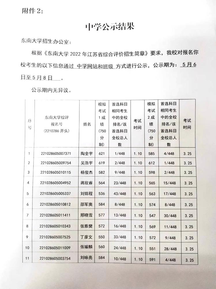 2022年雨花台中学报考东南大学综合素质评价公示结果
