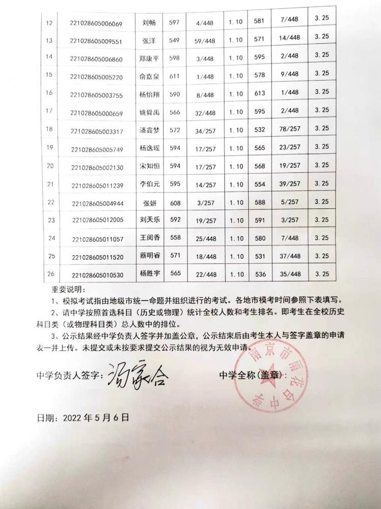 2022年雨花台中学报考南京大学综合素质评价公示结果