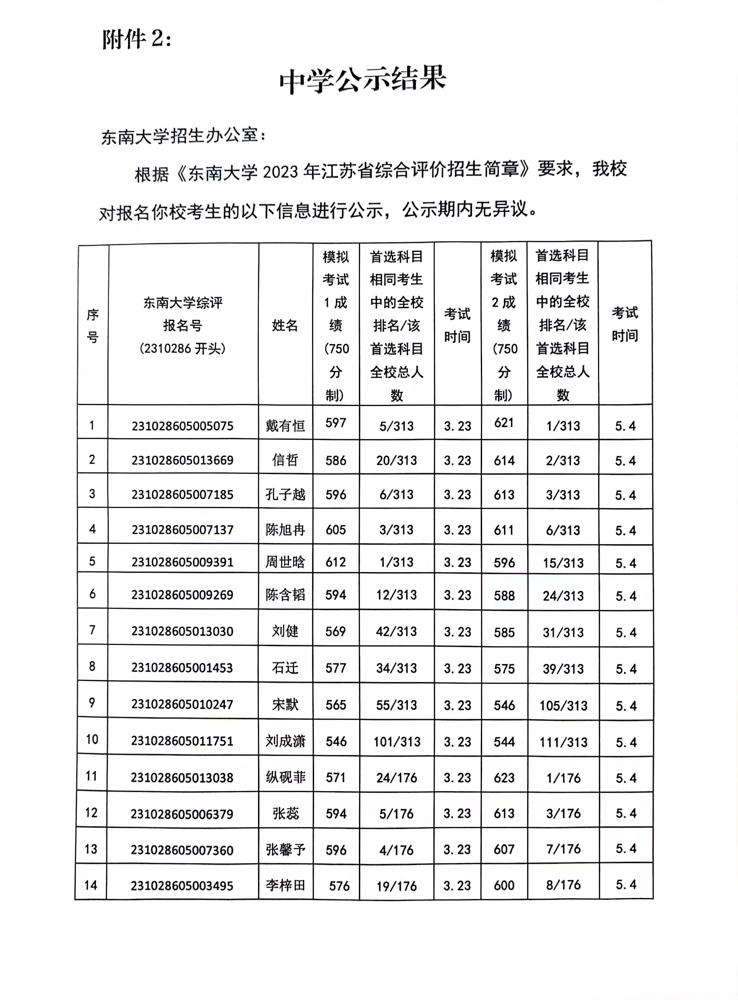 2023年雨花台中学报考东南大学综合素质评价公示结果
