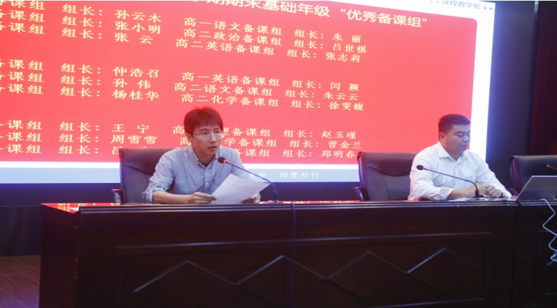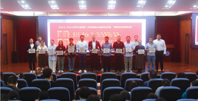 首先,由胡景月主任宣读2023-2024年度第二学期期末考试基础年级绩效表彰决定,刘进全副校长分别为“绩效优秀备课组”和“绩效优秀班级”教师代表颁奖并合影。