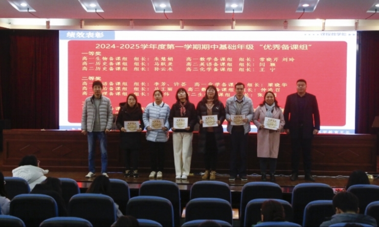 胡景月主任宣读了2024-2025年度第一学期期中考试基础年级绩效表彰决定,刘进全副校长为“绩效优秀备课组”和“绩效优秀班级”的教师代表颁发奖项并合影留念。