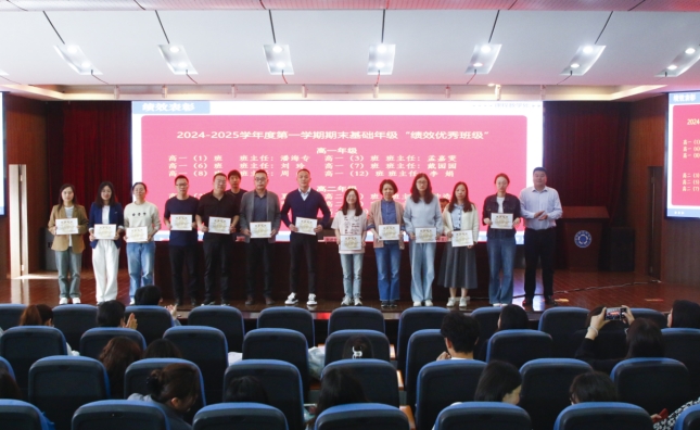 首先,由胡景月主任宣读2024-2025年度第一学期期末考试基础年级绩效表彰决定,刘进全副校长分别为“绩效优秀备课组”和“绩效优秀班级”教师代表颁奖并合影。与此同时,