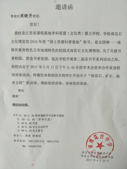 雨花台中学书香校园系列活动之周晓丹作家邀请函