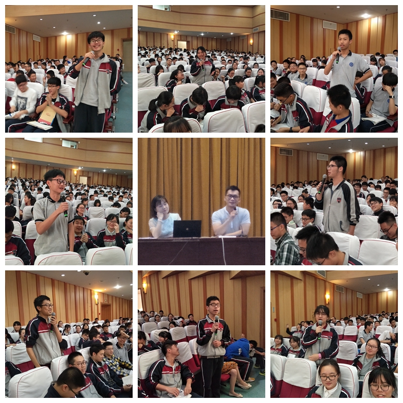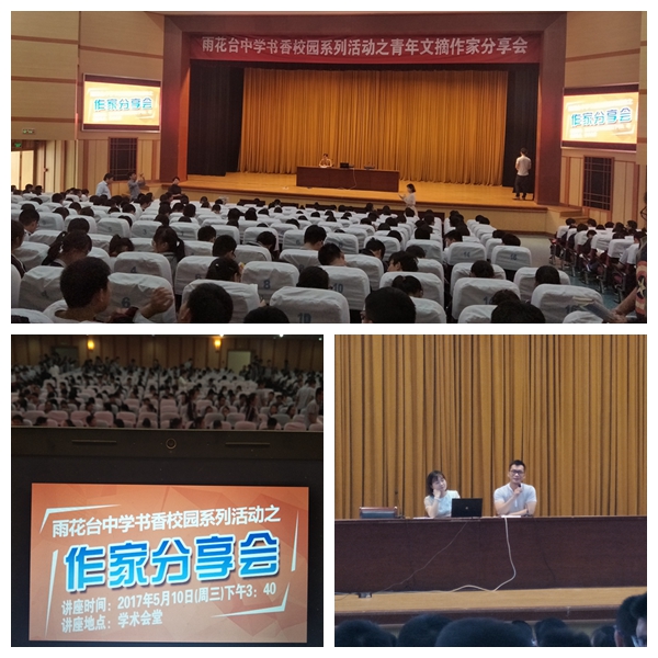 2017年5月10日下午,雨花台中学高一年级全体学生在班主任的带领下参加由雨花台中学图书馆、高一年级部主办,南京雨花邮政局协办的书香校园系列活动之作家分享会。来到现场的是《青年文摘》杂志社的骨干编辑徐剑和李点。他们与大家分享他们的成长故事和青春感悟,其中有经验也有教训,有哲理也有方法,给同学们带来欢笑的同时也带来了启发和思考。