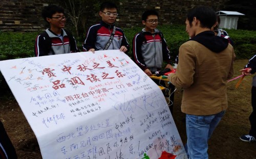 为了让人们加强对传统习俗的认识,了解环保的重要性,高一(7)团支部利用中秋佳节在玄武湖开展了以“赏中秋之美,品阅读之乐”为主题的活动。