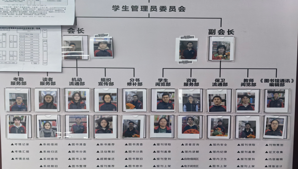 | 10 | 5 | 李梦鸢 | 学生阅览部副部长+报刊上架整理 | 22 | 11 | 车梦希 | 读者服务部副部长+书架整理 |