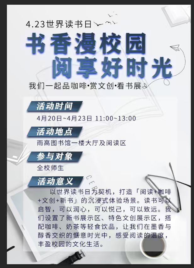 ✨ 4.23世界读书日将至,为丰富校园文化生活,营造轻松惬意的书香氛围,雨高图书馆特推出「书香漫校园 阅享好时光」主题活动,邀全校师生共赴阅读之美!