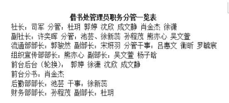2、建立学生管理员工作职责,分工明确,从学生管理员委员会会长到干事建立明确分工,利用课余时间发扬志愿者服务精神,努力为读者提供最好的服务。