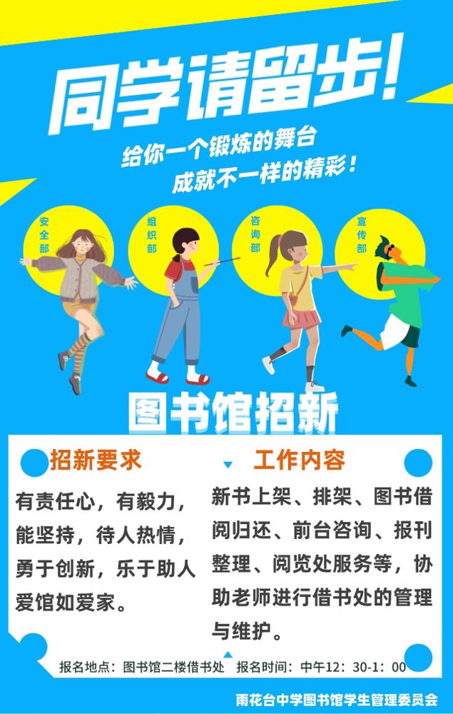 招新地点:图书馆二楼借书处(报名登记)