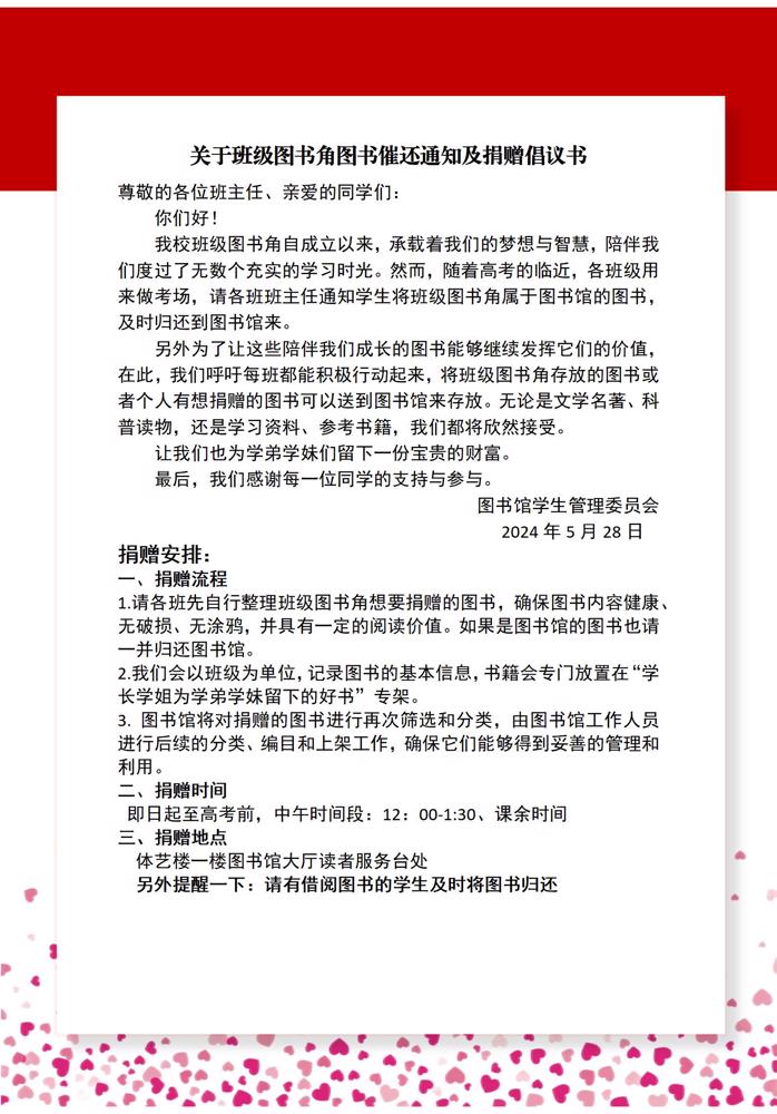 关于班级图书角图书催还通知及捐赠倡议书