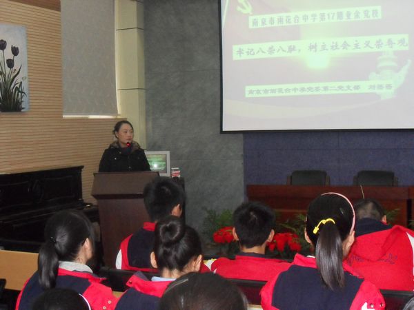 12月6日中午12:30,我校第二党支部宣传委员刘蓓蓓老师为学生上了一节课题为 “牢记八荣八耻,树立社会主义荣辱观”的党课。刘老师以多个热点事件为例,解读了胡锦涛总书记的“八荣八耻”,最后号召大家从自己开始,从分析身边的实际案例开始,牢固树立社会主义荣辱观。多个时事案例的分析让理论变得更加轻松易领悟,使同学们得到了很好的教育。