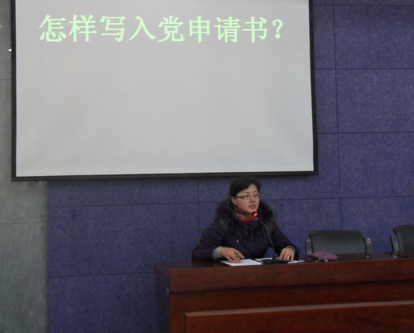 我校第十七期业余党校培训班接近尾声,同学们已经系统的学习了关于党的基本知识。 12月15日中午,第十七期业余党校最后一课“如何写入党申请书”在音乐教室准时开课。本节课由党委韦伟副书记主讲,课上,韦书记详细地介绍了入党申请书的每一个步骤及书写的注意事项。最后韦书记希望同学们认真书写并将申请书递交到团委,早日成为一名入党积极分子。