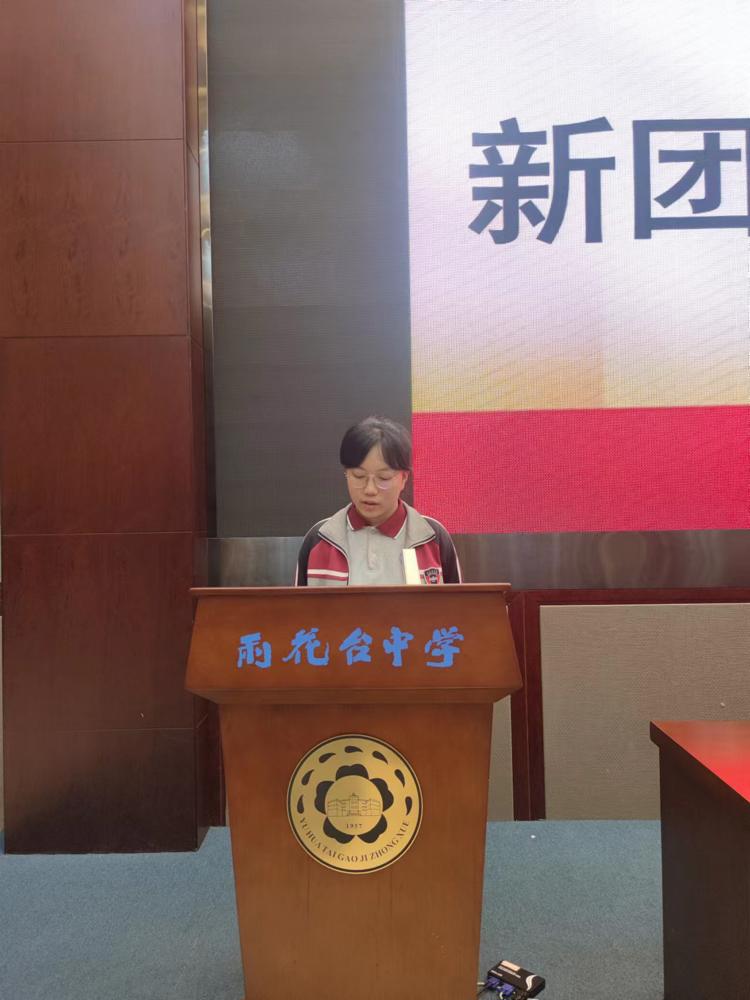 入团仪式以铿锵有力、激昂人心的齐唱国歌拉开序幕。在入团仪式上,新团员们手握团员证,胸戴共青团团徽,这一刻,意味着他们真正的成为了一名共青团员。本期新团员代表高三(10)班的韩熙宇同学发表了入团感言。她说到,在共青团的大家庭中,在班级的志愿者活动中,实践能力在提升,理想信念也在坚定,以自己成为一名共青团员为荣。 随后,张艺涵老师为新团员提出了希望和要求,勉励新团员们以团员标准严格要求自己,努力增长才干,发挥模范作用,吃苦在前,享乐在后,用自己的行动展现新时代青年学生的形象。