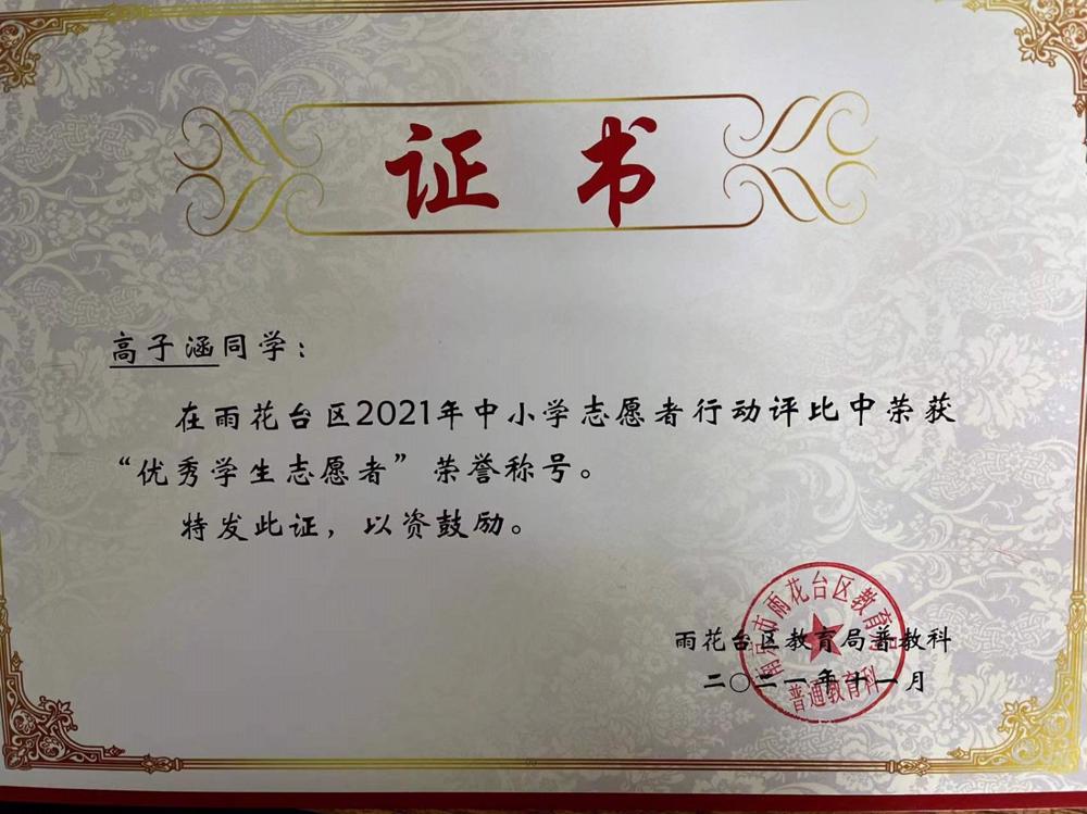 【喜报】雨花台中学岱山校区高子涵、苏华鑫同学荣获区“优秀学生志愿者”荣誉称号