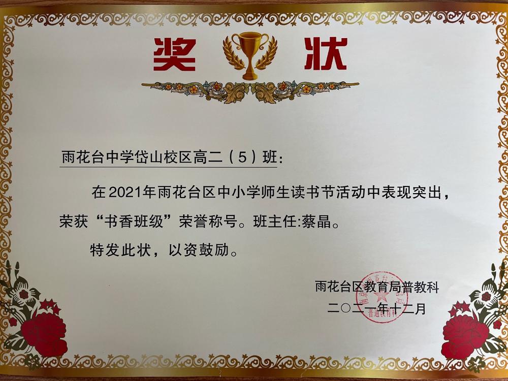 【喜报】雨花台中学岱山校区高一(4)班(班主任:孟欣欣)、高二(5)班(班主任:蔡晶)在2021年区中小学师生读书节活动中荣获“书香班级”荣誉称号!