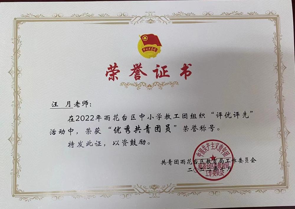 【喜报】汪月老师在2022年雨花台区中小学教工团组织“评优评先”活动中荣获“优秀共青团员”荣誉称号