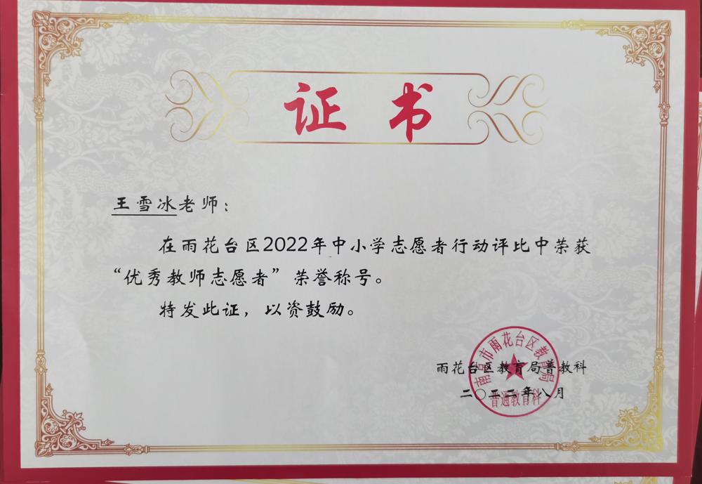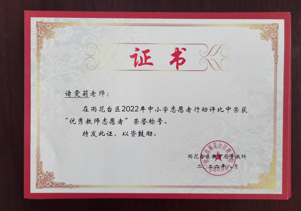 【喜报】诸雯莉、王雪冰、纪明月、史茜茜四位老师在雨花台区2022年中小学志愿者行动评比中荣获“优秀教师志愿者”荣誉称号