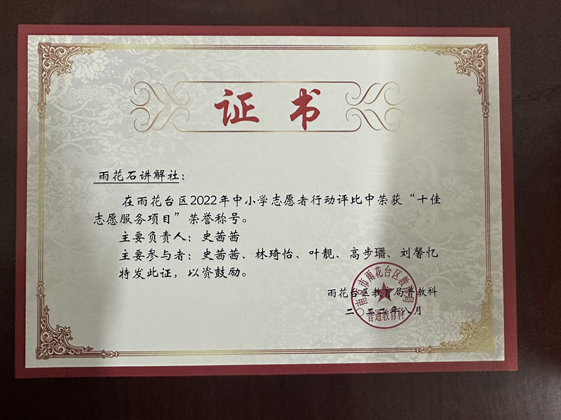 【喜报】雨花石讲解社在雨花台区2022年中小学志愿者行动评比中荣获“十佳志愿服务项目”荣誉称号