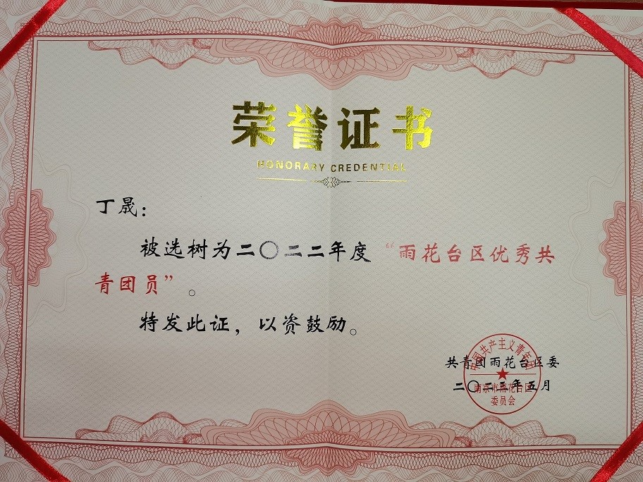 【喜报】我校丁晟同学被选树为2022年度“雨花台区优秀共青团员”