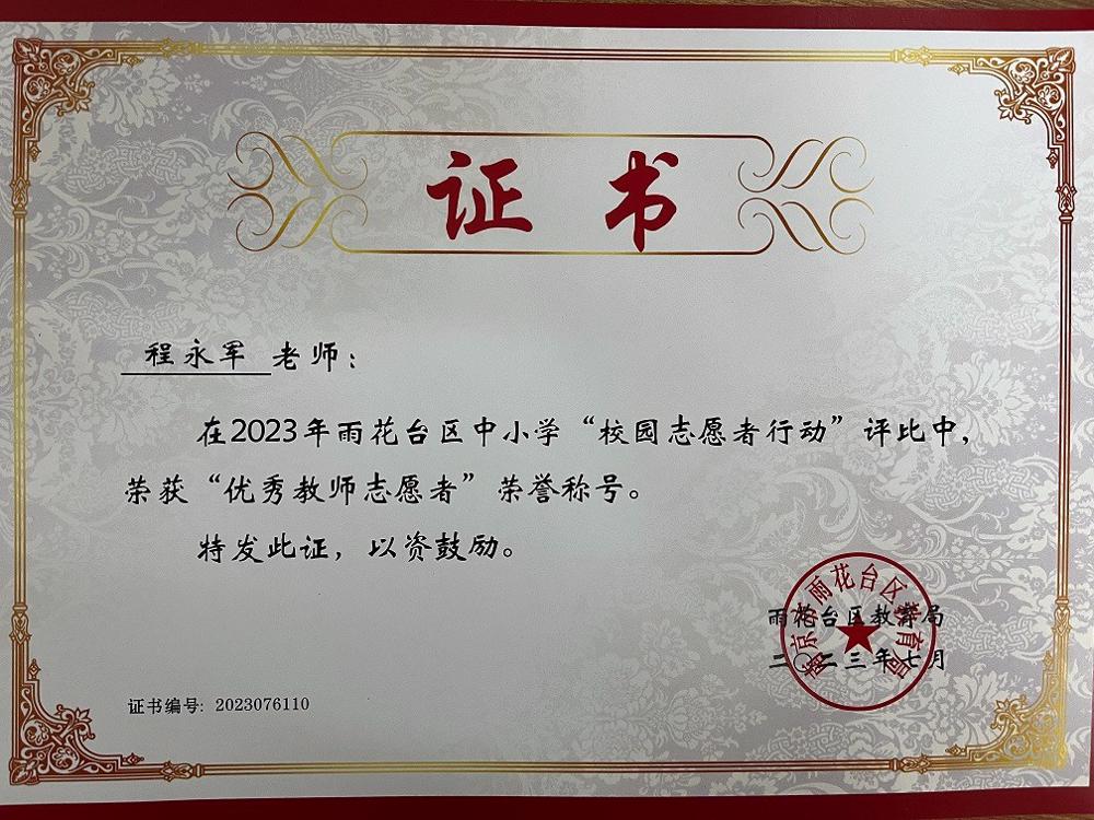 【喜报】程永军老师在2023年雨花台区中小学“校园志愿者行动”评比中荣获“优秀教师志愿者”荣誉称号。