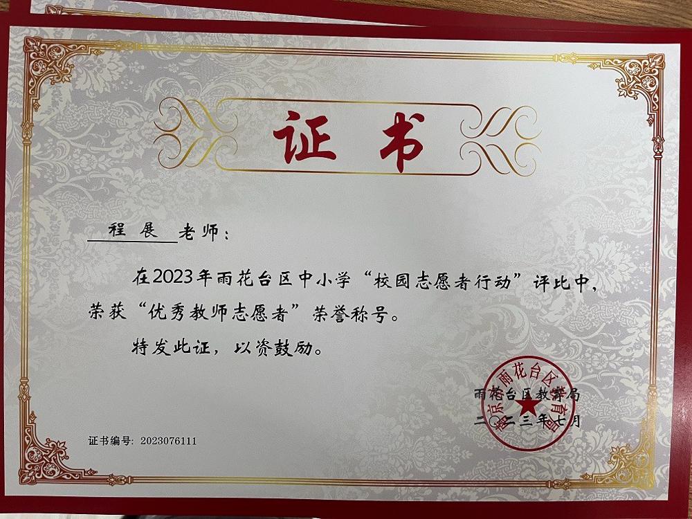 【喜报】程展老师在2023年雨花台区中小学“校园志愿者行动”评比中荣获“优秀教师志愿者”荣誉称号