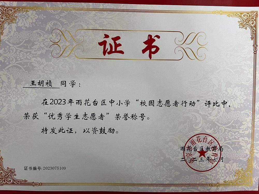 【喜报】王胡祯同学在2023年雨花台区中小学“校园志愿者行动”评比中荣获“优秀学生志愿者”荣誉称号。