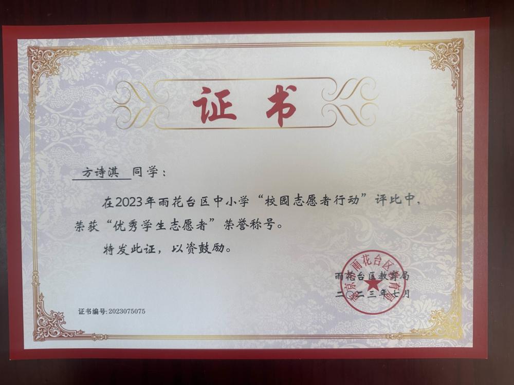 【喜报】我校方诗淇同学荣获区“优秀学生志愿者”荣誉称号