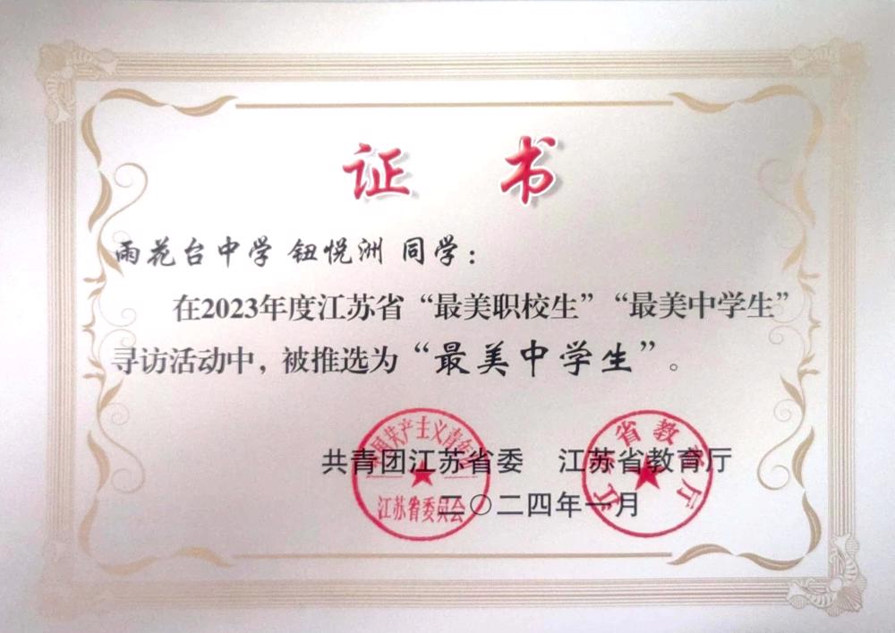 【喜报】钮悦洲同学在2023年度江苏省“最美中学生”寻访活动中,被推选为“最美中学生”