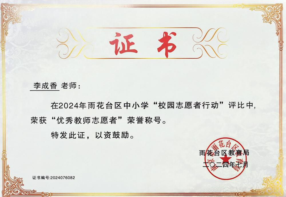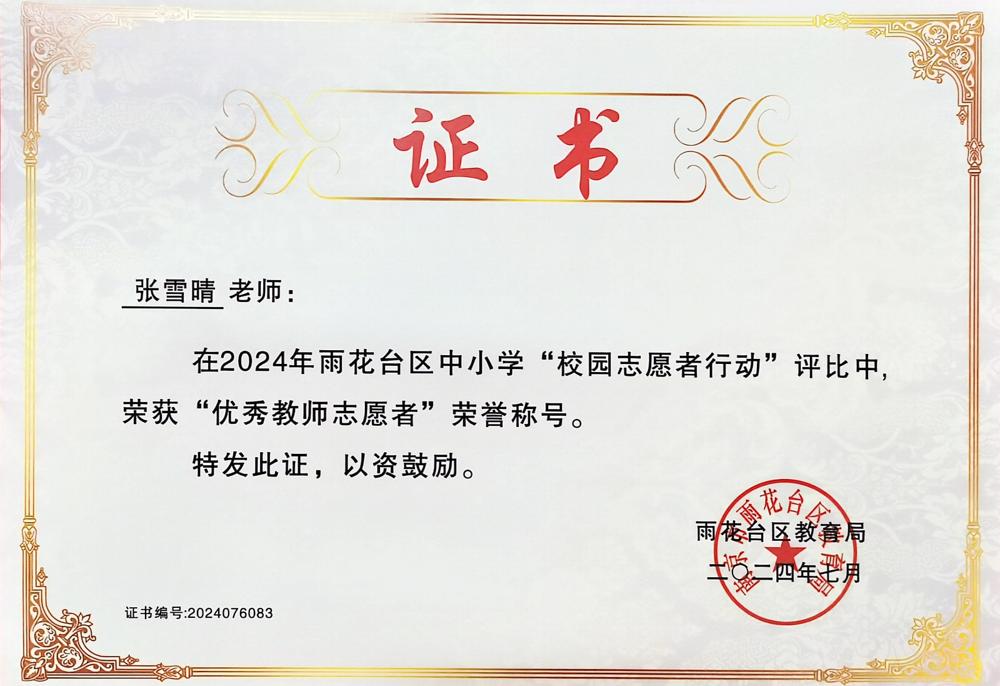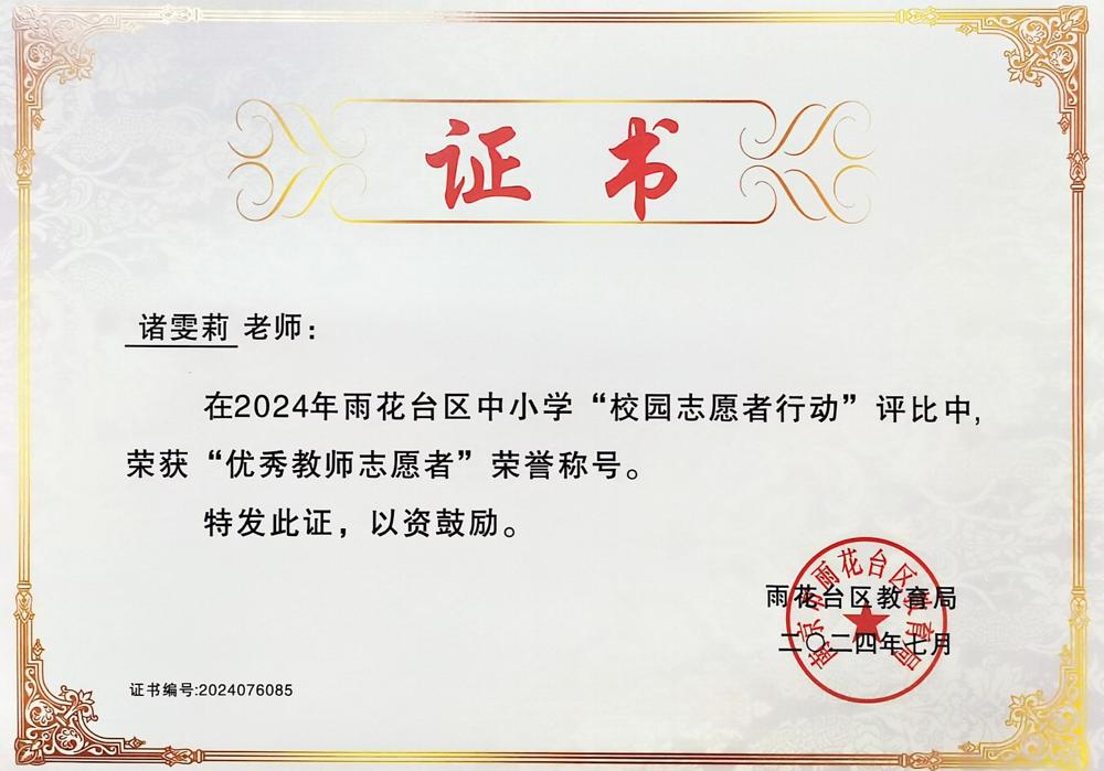 【喜报】我校诸雯莉、朱迪、张雪晴、李成香四位老师在2024年雨花台区中小学”校园志愿者行动”评比中,荣获“优秀教师志愿者”荣誉称号