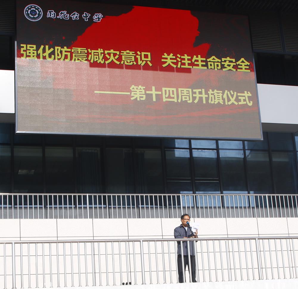 今年5月12日是我国第17个全国防灾减灾日,主题是“人人讲安全、个个会应急——排查身边灾害隐患”。防震减灾是与我们每个人息息相关的生活必修课,校园作为人员密集场所,更需通过知识普及、应急演练提升防灾减灾能力。升旗仪式前,全校师生开展了应急疏散演练,演练结束后,唐宇副校长对此次疏散演练活动进行了细致的总结,他充分肯定了本次演练的成效,同时提出了学校安全工作的进一步要求。在本次升旗仪式上,校安全办公室主任薛峰老师作了国旗下发言。他结合汶川地震等案例,强调我国自然灾害频发的严峻形势,并向全体师生发出了倡议:强化安全意识、学习防灾技能、参与应急演练,筑牢防线,从细节做起。