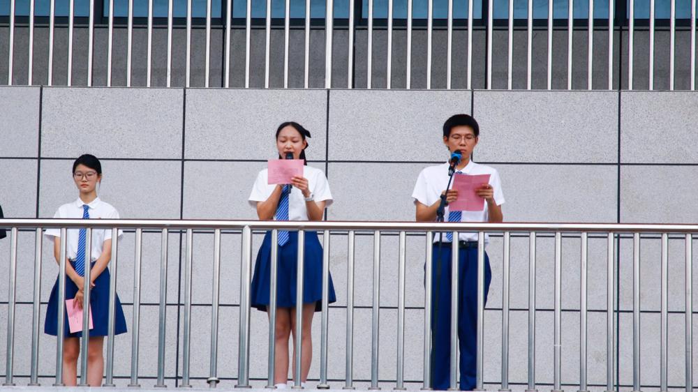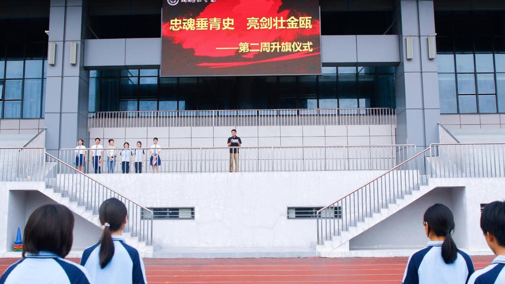 9月8日,我校举行了第二周升旗仪式,主题为“忠魂垂青史,亮剑壮金瓯”,担任本周升旗任务的是高二(12)班石悠然、陈紫涵两位同学。