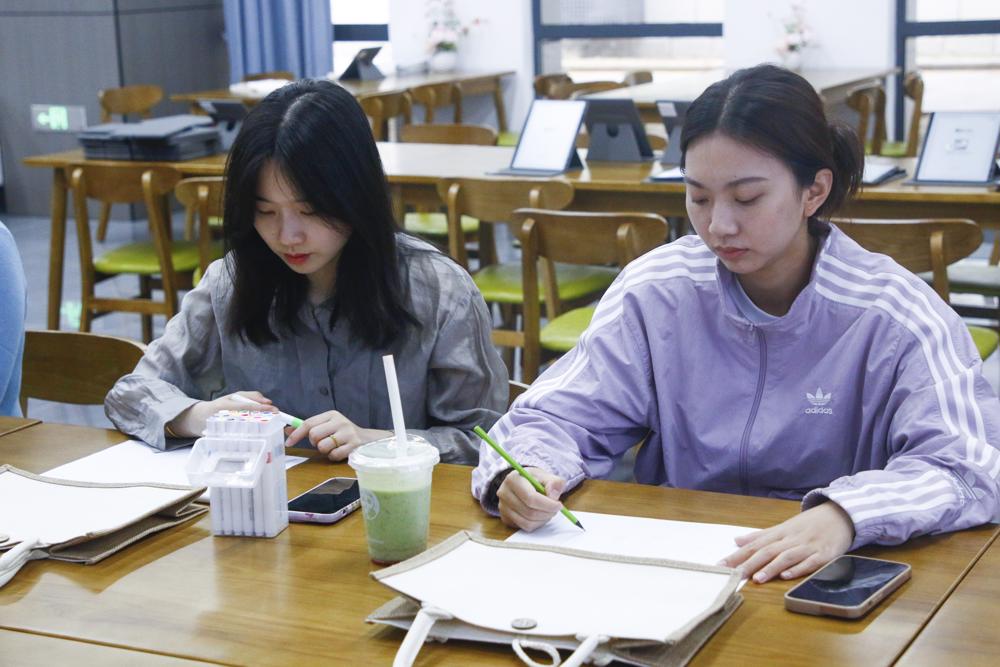 活动中,教师们在雨花台中学专职心育教师沈彦晗和张曼地专业引导下,先在帆布包上绘制了房树人画作,通过房屋、树木和人物的象征意义,深入探索内心世界。随后,在正念冥想中觉察并接纳当下的情绪,表达对自己的感恩,围绕感恩主题完成了意象绘画,并分享了对未来的期待。