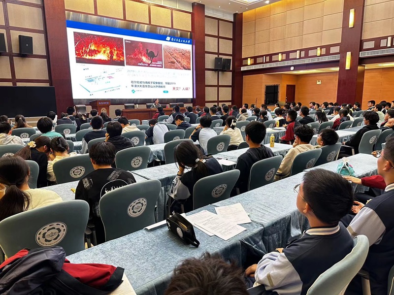 王教授以大量的数据和照片作为支撑,生动形象地为同学们讲解了大气科学所属学科具体门类、发展史、发展进程阶段、中西方大气科学成就等科学知识。同学们神情专注,听讲认真,大礼堂不时传来阵阵掌声。最后王教授勉励同学们立足学业,夯实基础,以勤学之火点亮梦想之光!