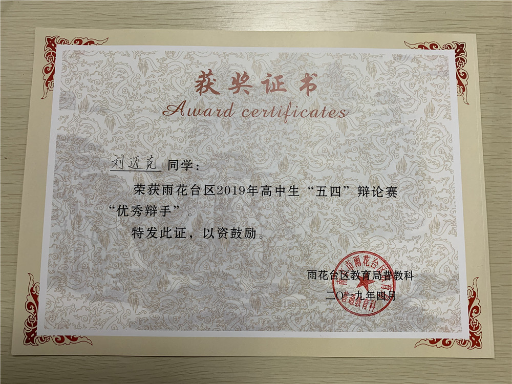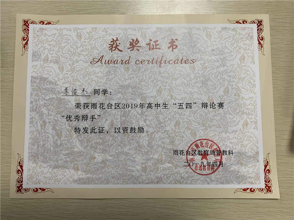 雨花台区2019年高中生“五四”辩论赛获奖学生