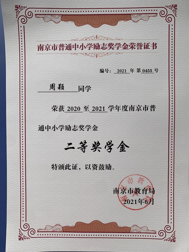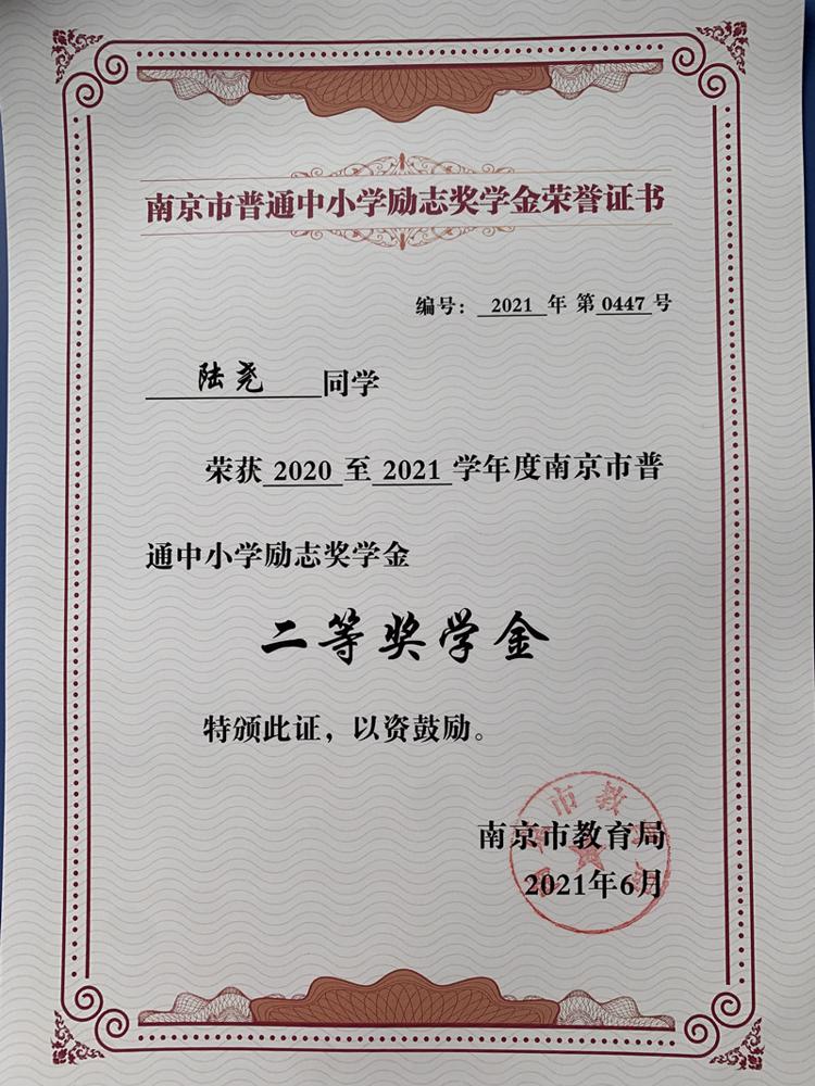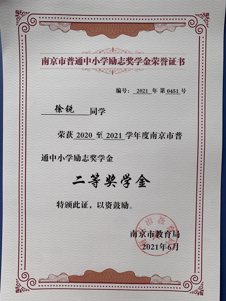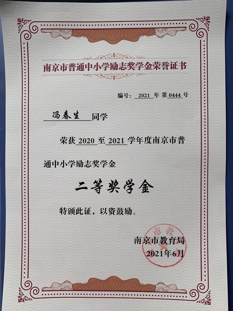 祝贺雨花台中学高中11位同学获得2020-2021学年南京市普通中小学励志奖学金二等奖