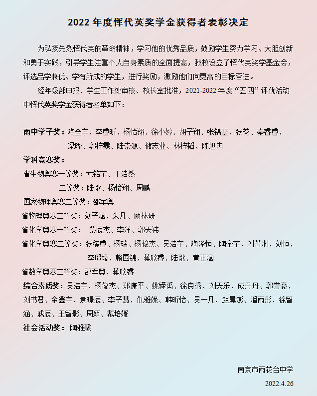 2021-2022学年度恽代英奖学金五四评优表彰名单